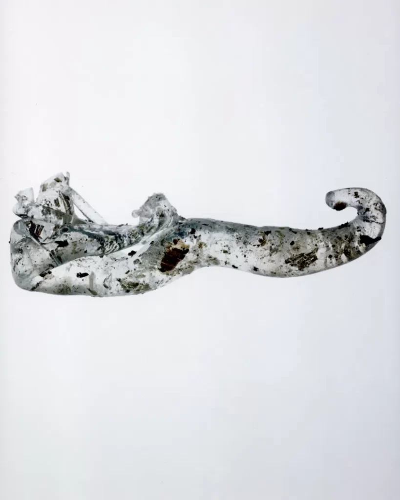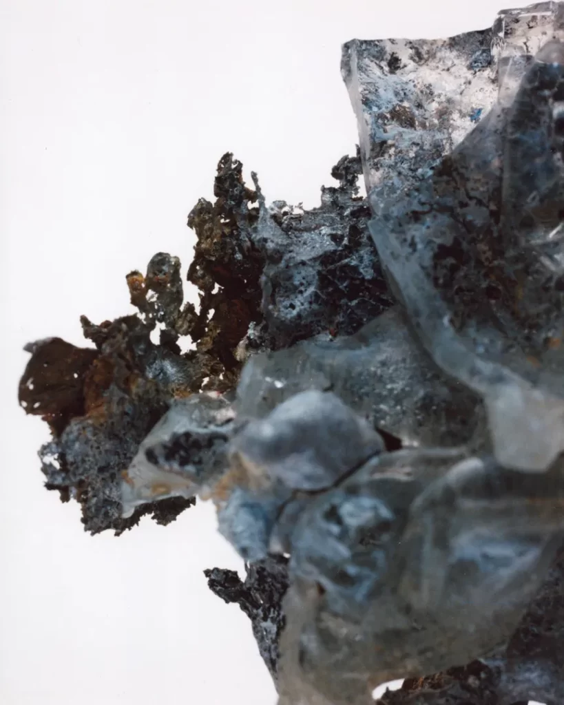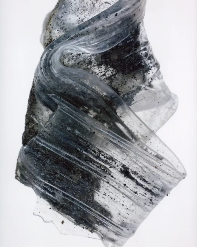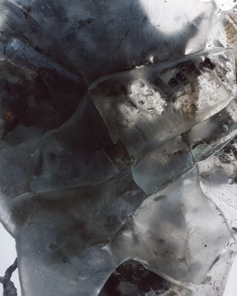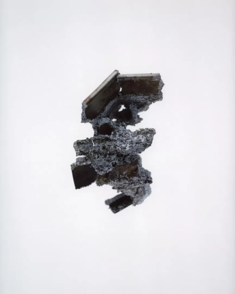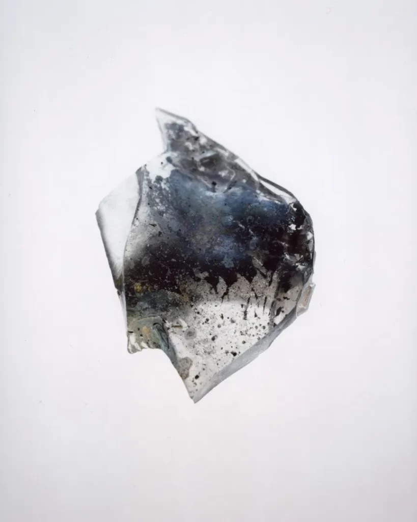 今回の作品では火災現場の跡地で拾い集めたガラス片や金属片を撮影した。それらは炎の熱によって変形し、消火による冷却の過程で独特の歪みやひずみを伴いながら固まっている。ガラスの内部には塵や破片が閉じ込められ、それ自体が火災と火災前の記憶を物理的に保存しているかのようだ。