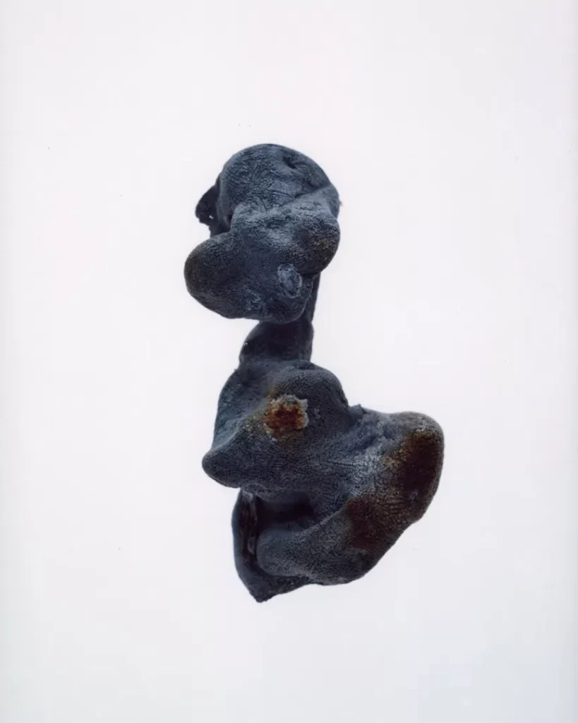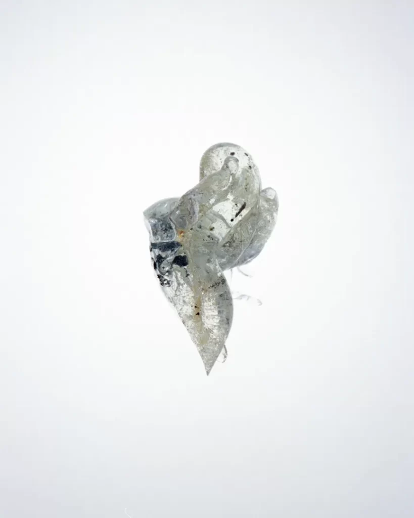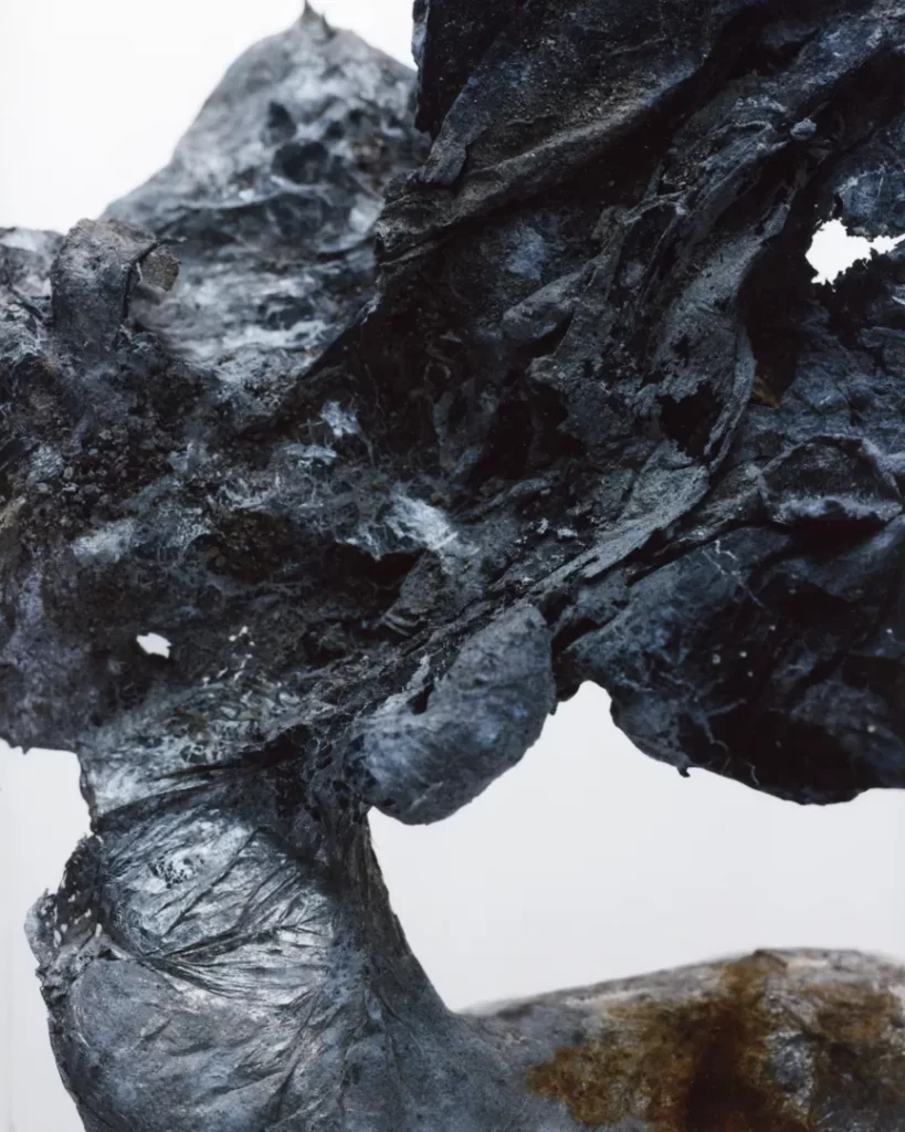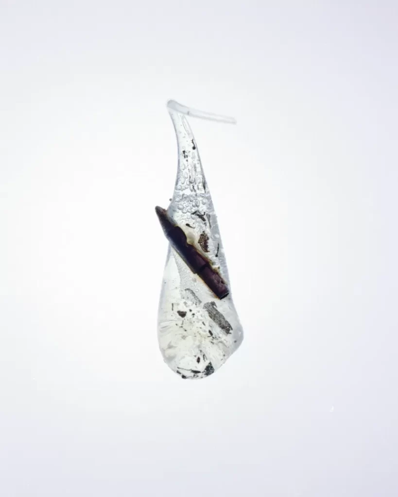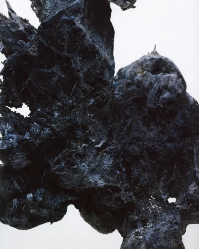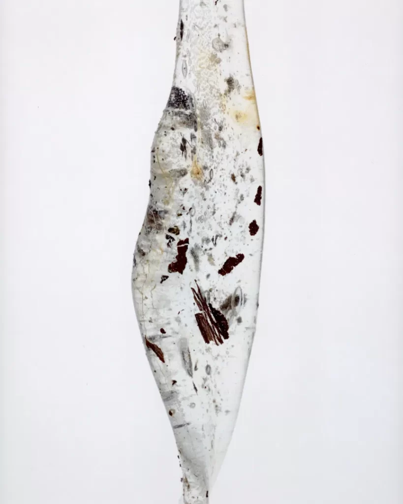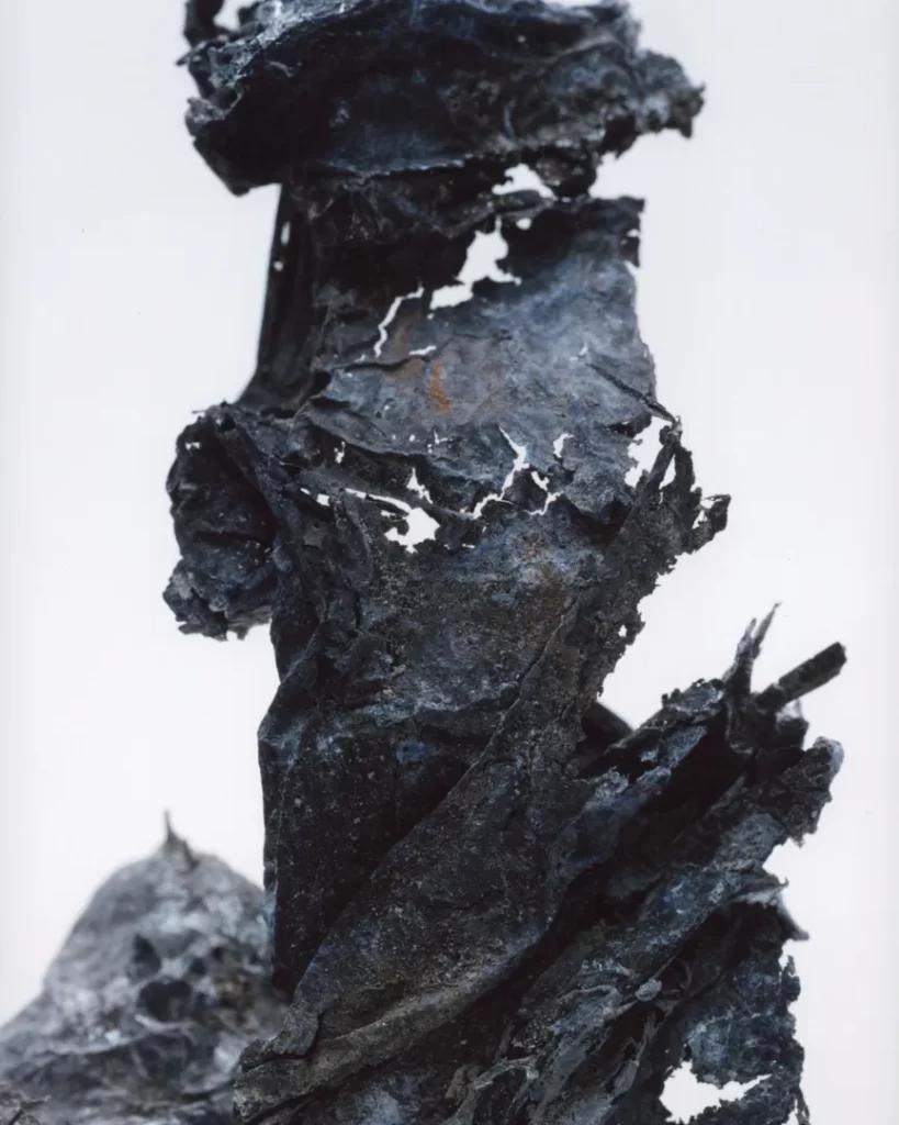 今回の作品では火災現場の跡地で拾い集めたガラス片や金属片を撮影した。それらは炎の熱によって変形し、消火による冷却の過程で独特の歪みやひずみを伴いながら固まっている。ガラスの内部には塵や破片が閉じ込められ、それ自体が火災と火災前の記憶を物理的に保存しているかのようだ。